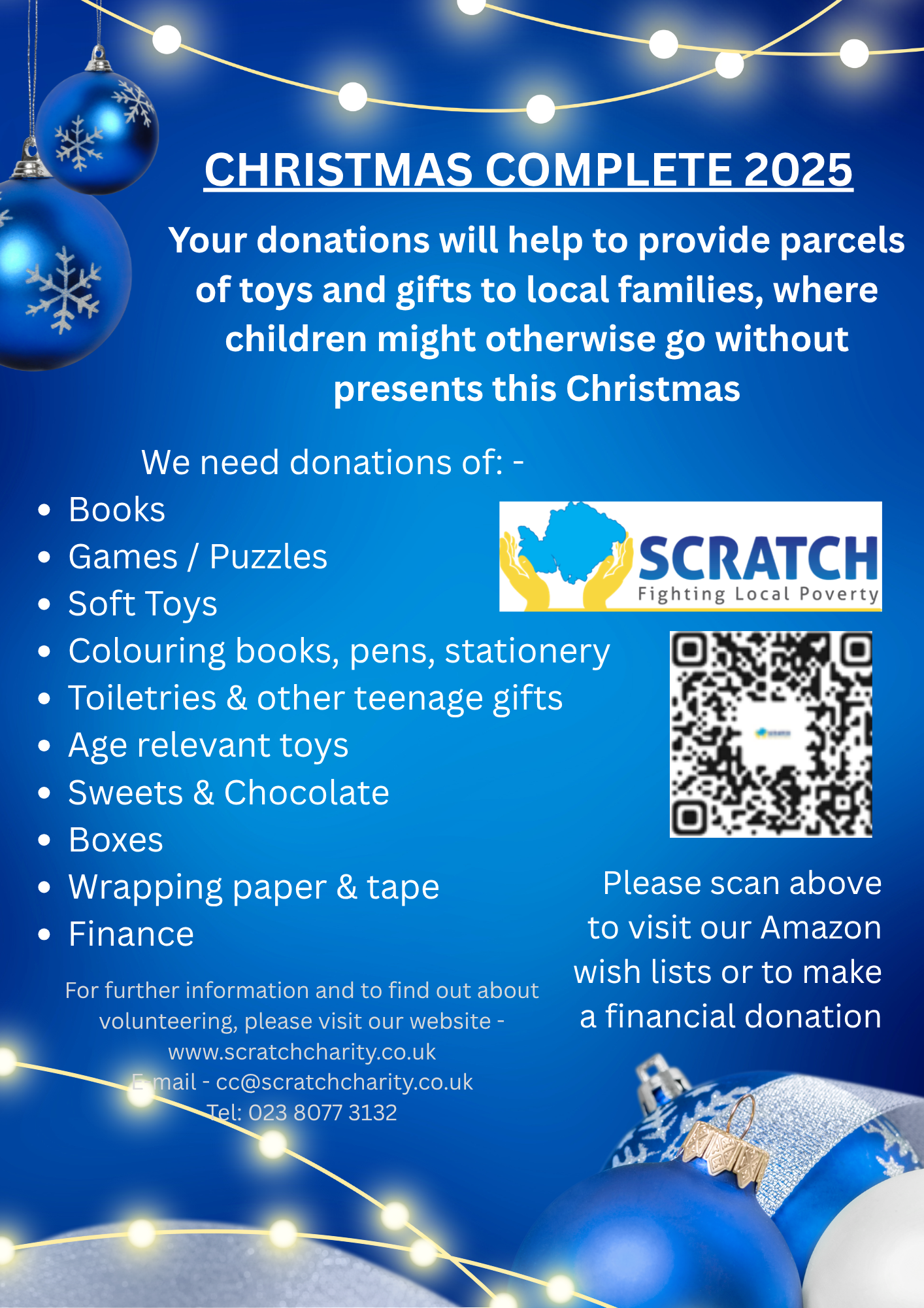 VOLUNTEERING - Most of our sessions have now been booked. However, there is still limited availability on Saturdays - 29th Nov (morning and afternoon), 6th Dec (afternoon only), 13th Dec (morning and afternoon) to help with the picking and packing. We are also looking for volunteers to help sort out donations during the mornings of Friday 21st and Friday 28th November. If you can help, please e-mail - cc@scratchcharity.co.uk. Thank you.